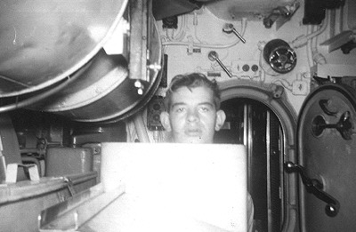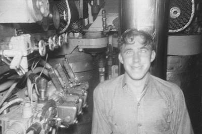 Gene Melton MM2 goofing off in the Forward Engine Room.