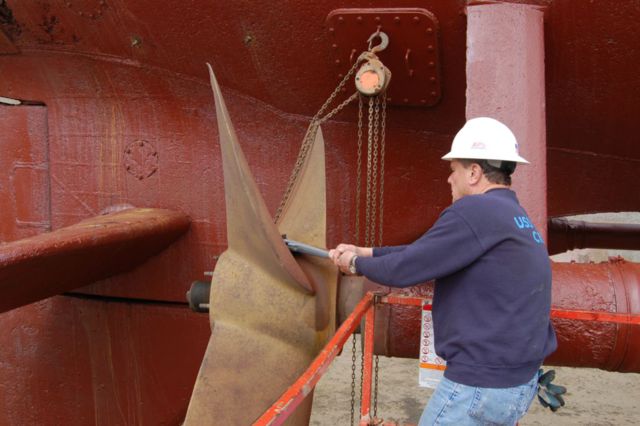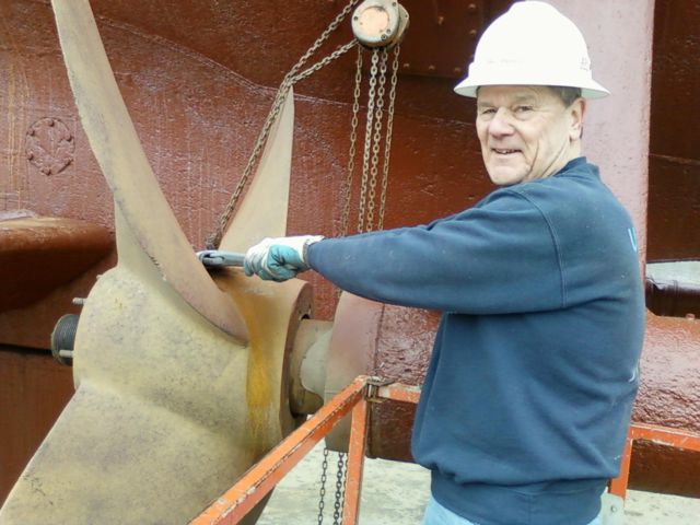 Dave Thames removing an old lifting eye from the starboard propellor.