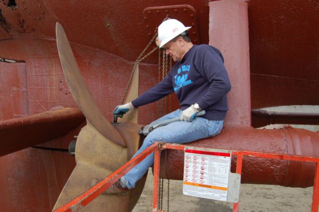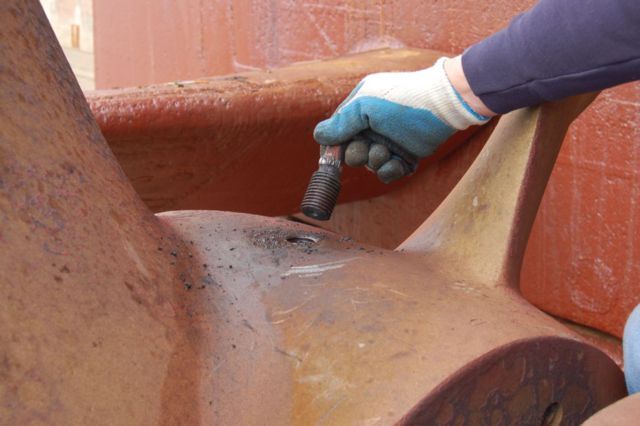 Dave Thames removing the old lifting eye from the top of the propellor.