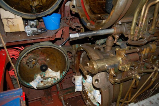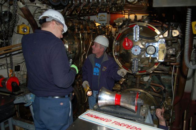 Frank Morgan checking out the Forward tubes, with assistance from Nat Little and Charlie Bohannon.