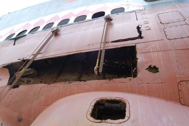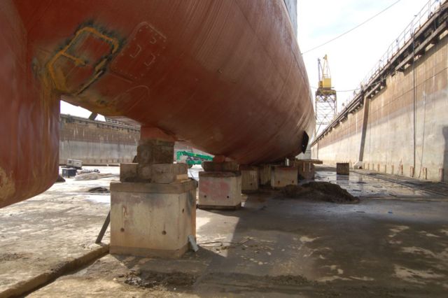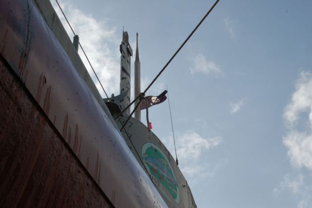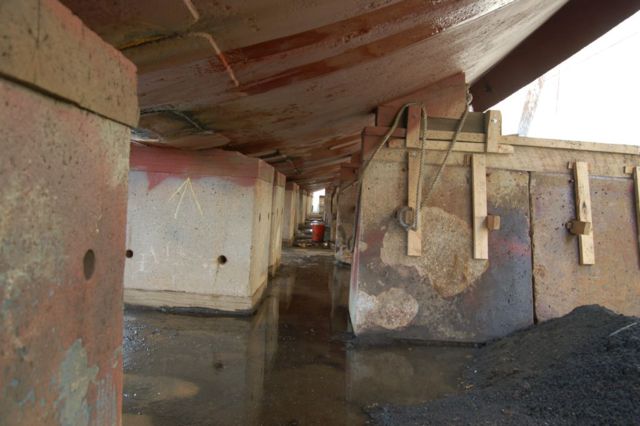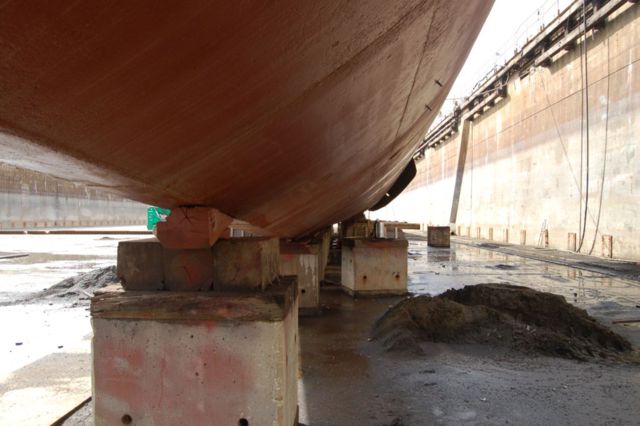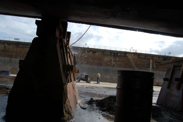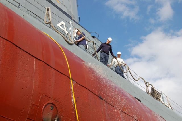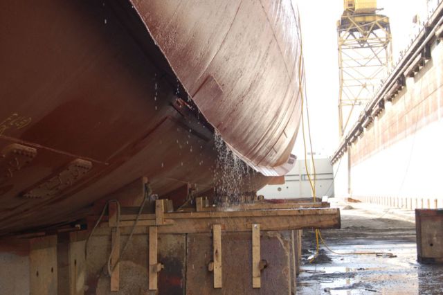 Water cascading off the port bilge keel as the crew does a washdown topside.