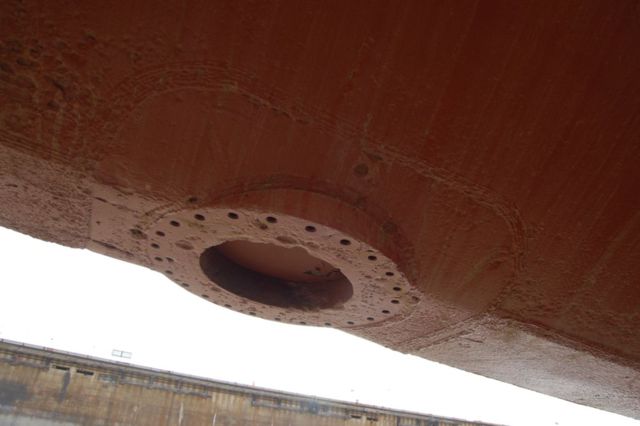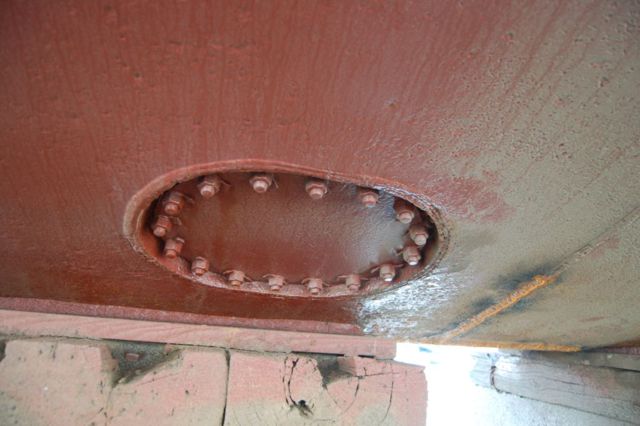Access plate for one of the tanks. Some of the seam welds can be seen to the right.