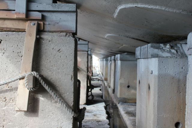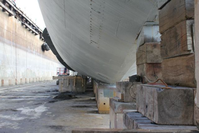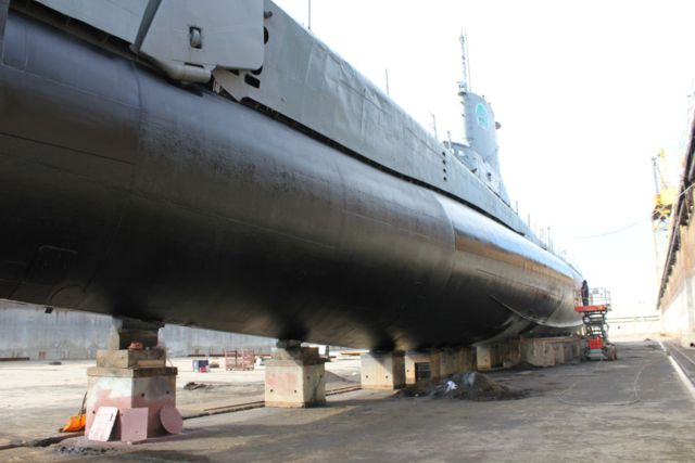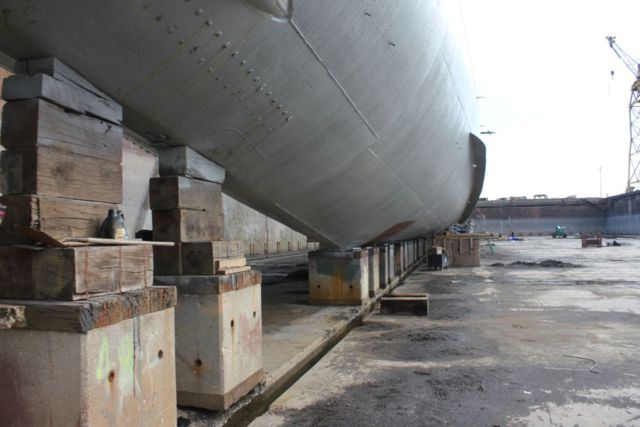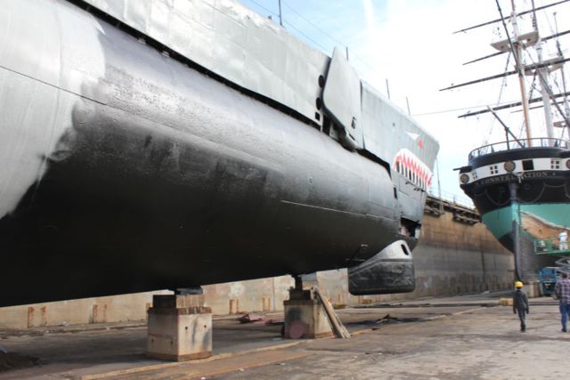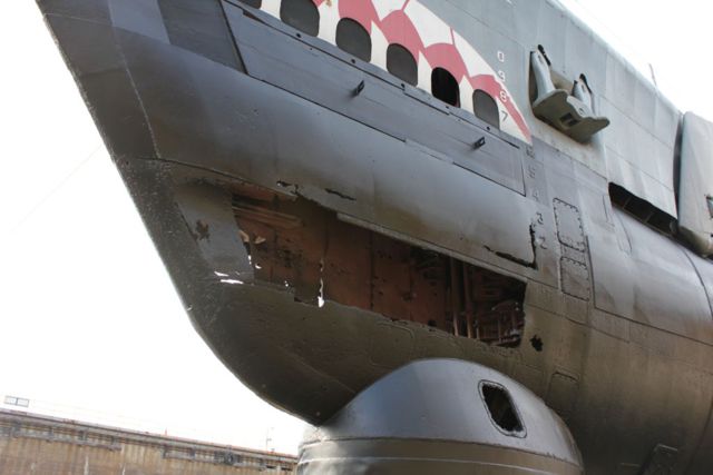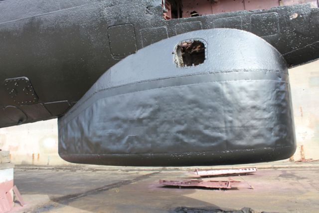 The row of studs seen on the hull here are where Zinc Anodes were attached while Torsk was in service.