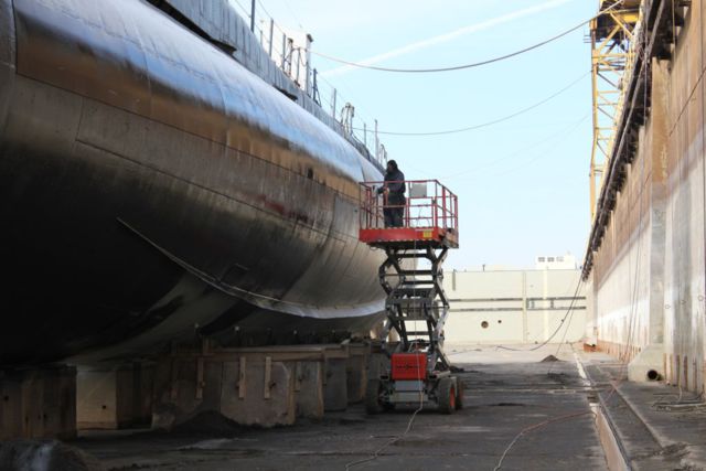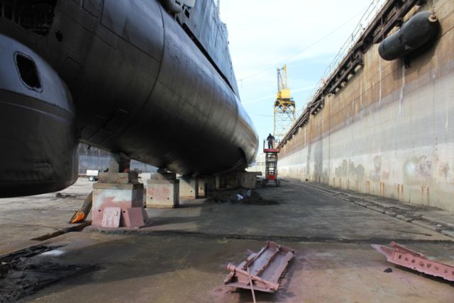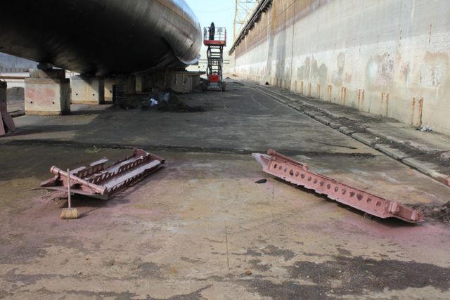 Port side looking aft, with torpedo tube shutters on dock floor.