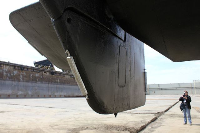 Starboard side of rudder, planes and shafts.
