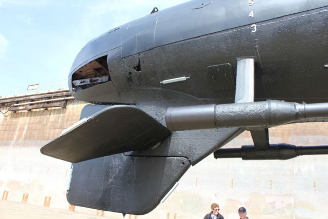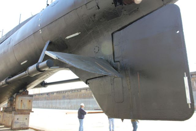 Port side of the rudder, planes and shaft.