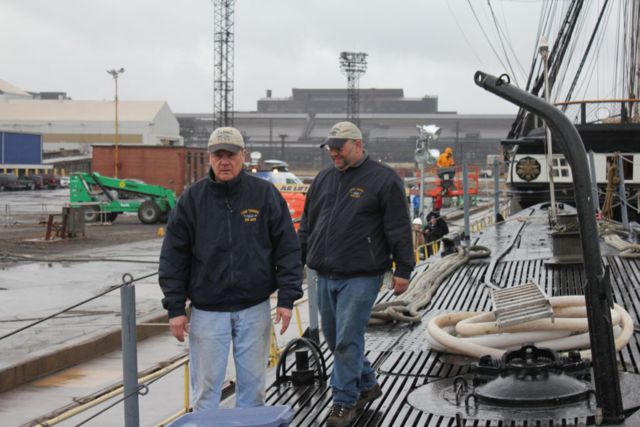 Dave Thames and Gil Bohannon walk the deck as a windy and rainy day greeted us