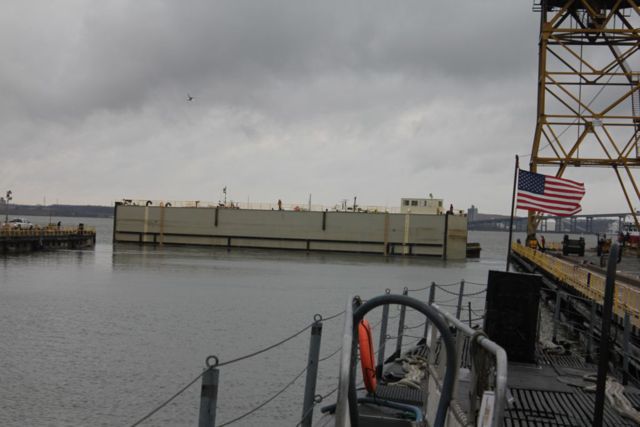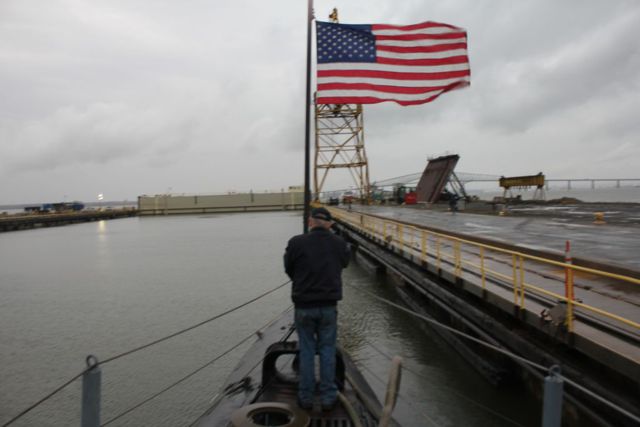 The caisson pulls away, opening up the dock for our exit.