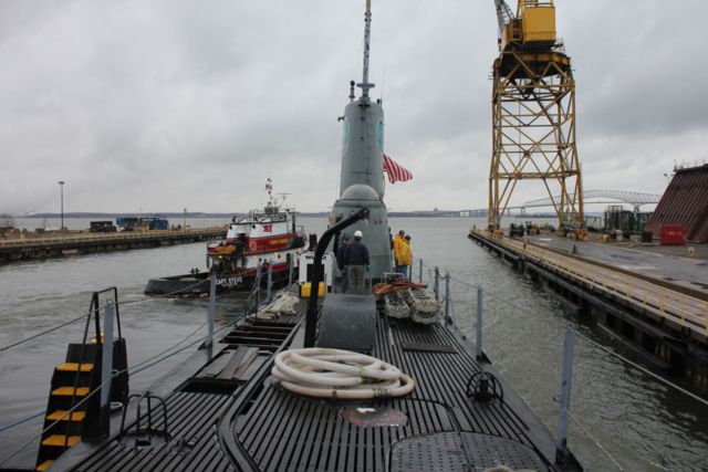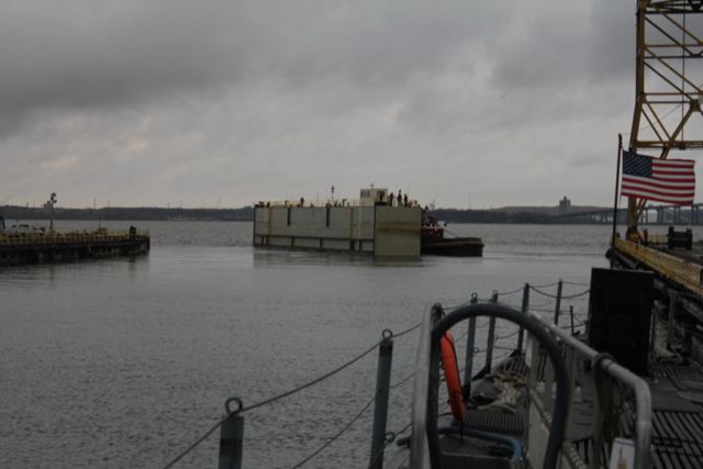 Tugs are removing the drydock caisson.
