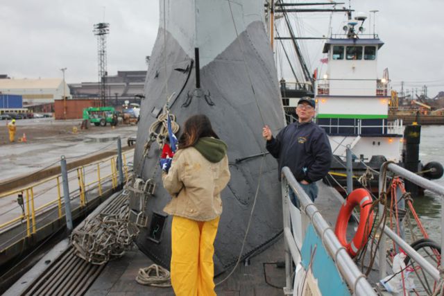 Chief Mike helps Rachel shift colors to underway as we back away from the dock.