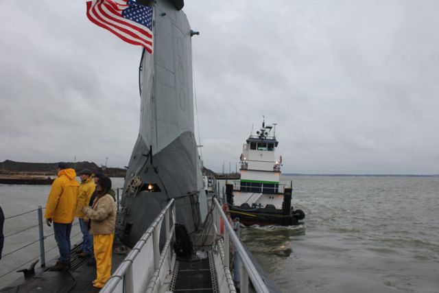 Looking over the bow as we back out.