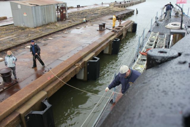 Heaving lines go across to the pier.