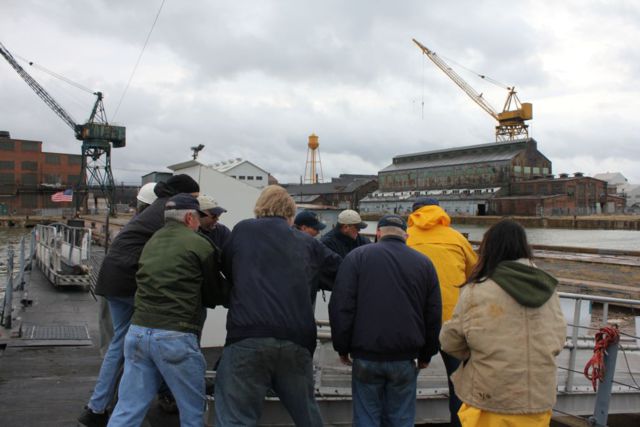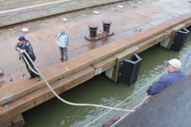 Time to manhandle the gangway across to the pier.