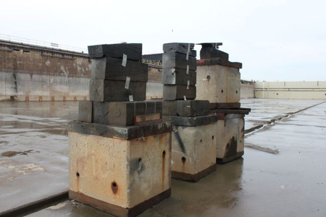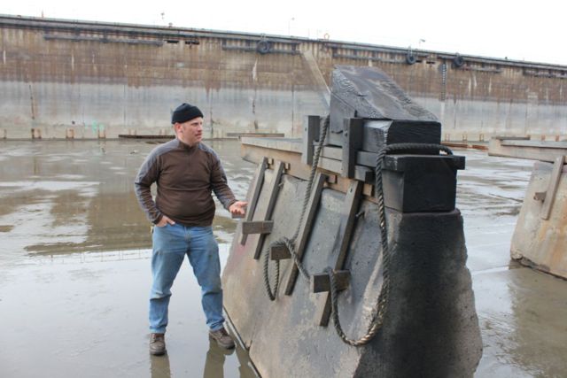 Museum curator Paul Cora stands next to one of the side blocks that were under Torsk.