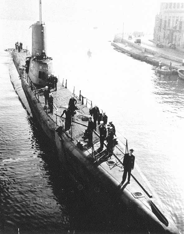 Torsk coming alongside the English sub tender HMS Fourth at Valetta, Malta on September 27, 1952. Chief of the boat Abner Reed is standing on the bow.