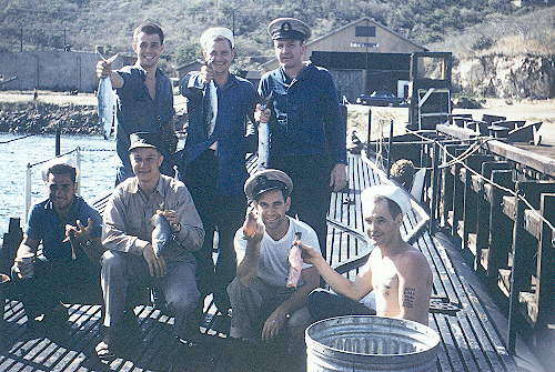 Front Row (L-R): Ralph Carfagno SN, Lt. Kearney, Bill Trimmer EMC, Herb Runge TM1