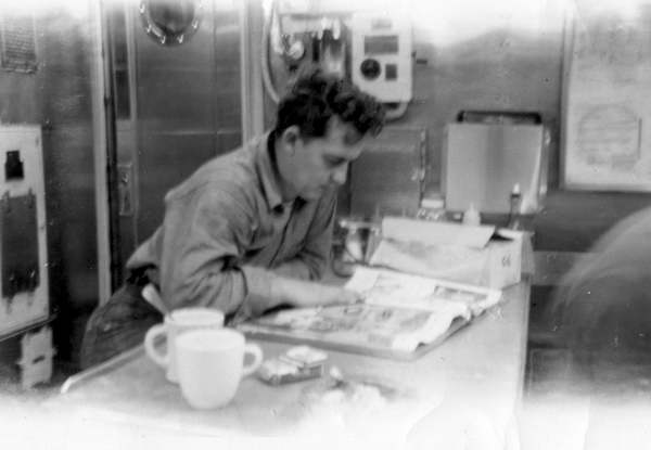 Hersey, ships cook, catches up on a French magazine. LeHarve, France. October 1957.