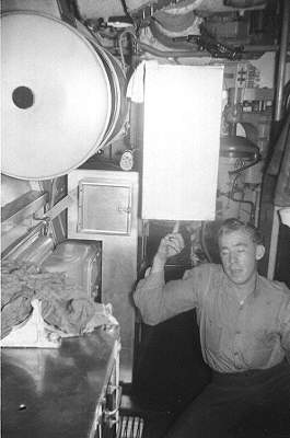 Gene Melton MM2 goofing off in the Forward Engine Room.
