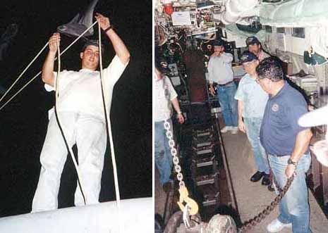 Ramjet and Cool Bob worked up in the overhead to rig the chainfalls at the torpedo loading hatch. Once they were rigged, lifting began and the skid started it's journey to the deck.