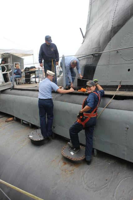 In this shot, Corey and Nat are on the tank tops to close the inspection cover over Main Ballast Tank 2C.