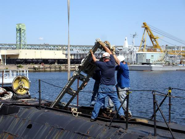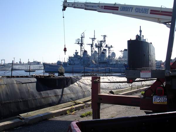 On Friday, June 22 several Torsk volunteers gathered in Philly to finish several days of parts removal from USS Trout. The final goal for this Friday was removal of the BQR-2B sonar console and several torpedo skids, using a rented crane.