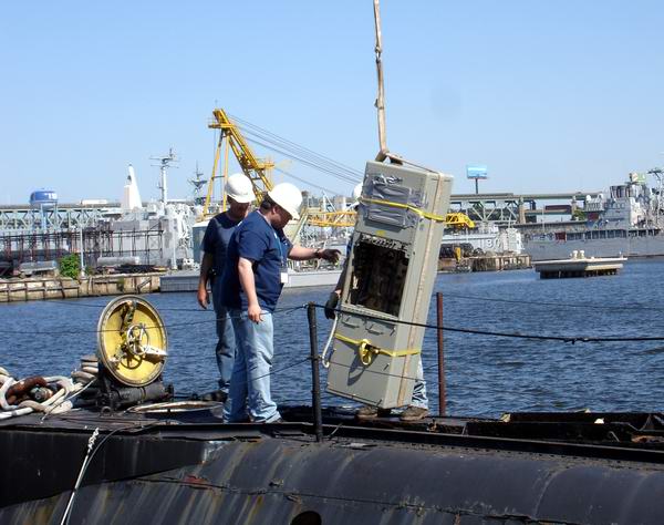 The first item to come topside through the forward torpedo loading hatch was the BQR-2B sonar console. The front panel was removed ahead of time to enable the cosole to fit through the water tight doors below, as well as the hatches topside.