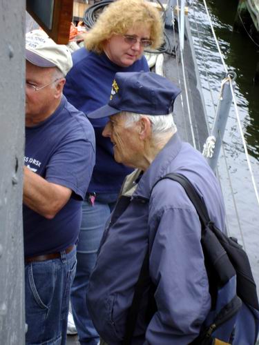 Chief Bill looks on while Tim tests the newly repaired sail door lock.