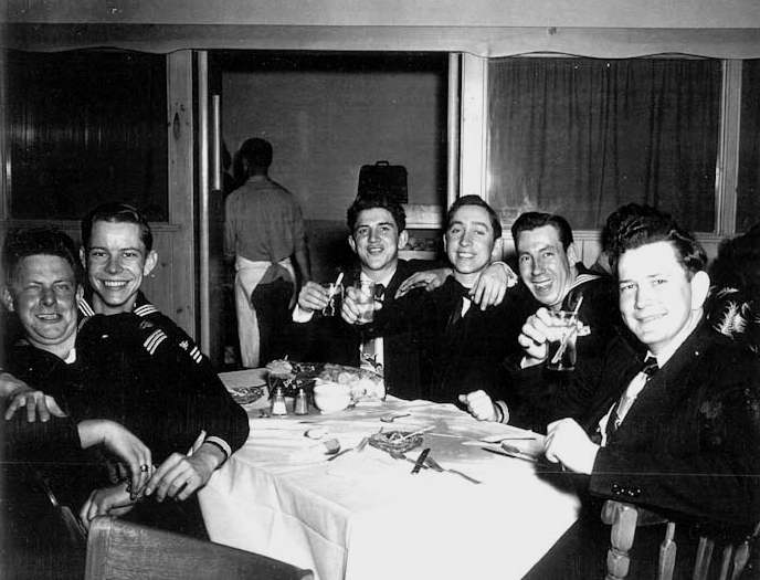 Torsk Ship's Party 1949 L-R: Jack Anderson, Radio Striker from Salt Lake City Leonard Glendening RM George Nault, Auxiliaryman from Lawrence, Mass. Unidentified crew member, possibly an engineman, from